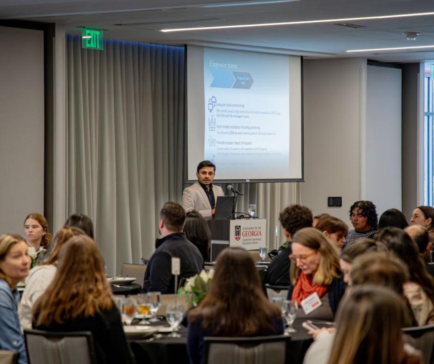 Image: UGA's Precision One Health is an extraordinary initiative aimed at realizing the synergies of research in animal and human health. The Precision One Health Symposium is an annual summit that brings interested researchers from multiple UGA Schools and Colleges together under one roof. IAI's Executive Director Prashant Doshi utilized the platform of this year's summit to deliver a keynote talk to a large audience on his vision for AI at UGA and IAI's role in shaping it. He availed the opportunity to also address the theme of this year's symposium, AI and Future of Health, which is also a theme of convergence identified by the Institute.